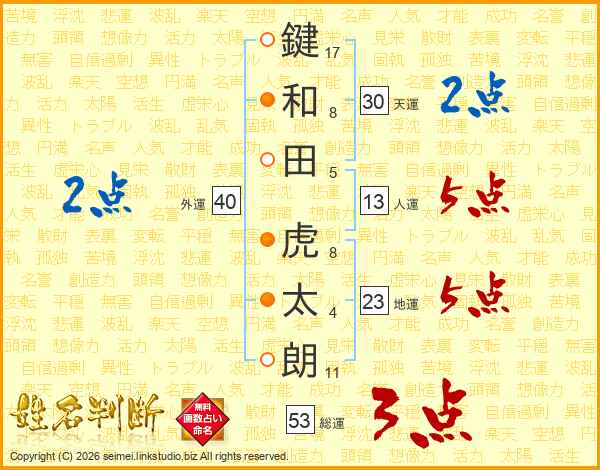 鍵和田虎太朗さんの天運は30画の2点!