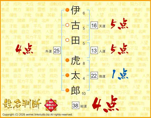 伊(6画)古(5画)田(5画) 虎(8画)太(4画)郎(10画)