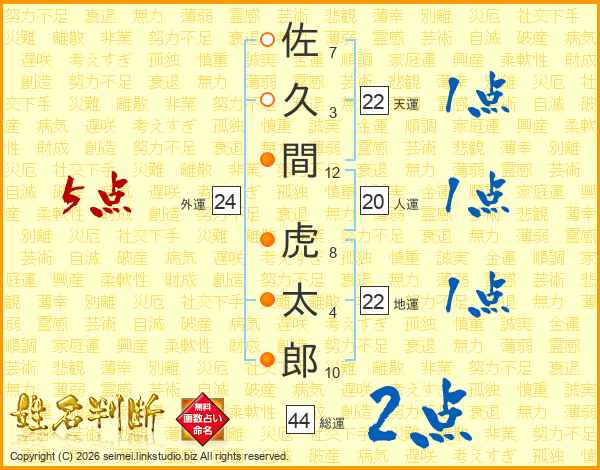 佐(7画)久(3画)間(12画) 虎(8画)太(4画)郎(10画)