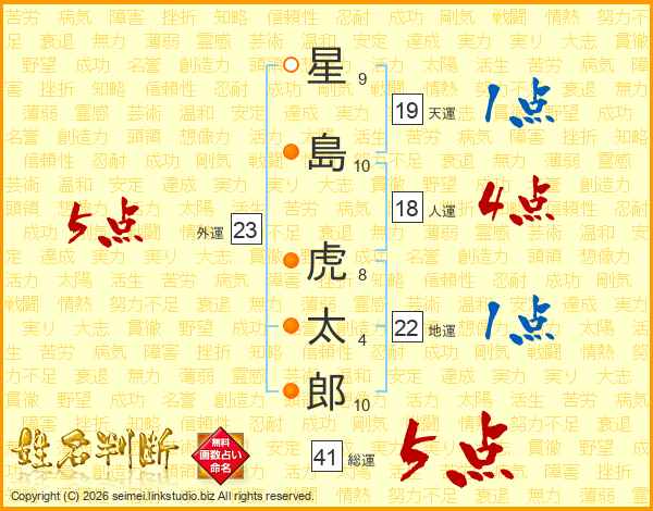 星(9画)島(10画) 虎(8画)太(4画)郎(10画)