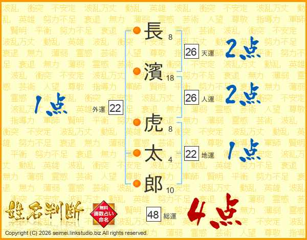 長(8画)濱(18画) 虎(8画)太(4画)郎(10画)