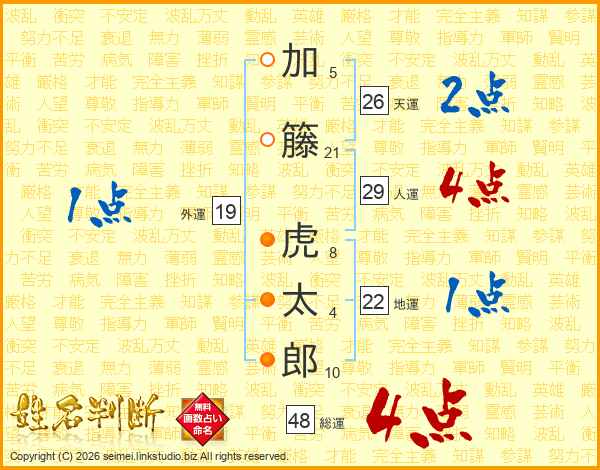 加(5画)籐(21画) 虎(8画)太(4画)郎(10画)