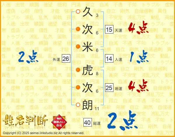 久(3画)次(6画)米(6画) 虎(8画)次(6画)朗(11画)