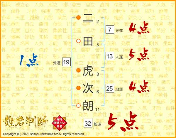 生活面を象徴する運勢です。外部から受ける影響力を表し、結婚運、家庭運や職場、環境への順応性を表します。総運から人運を引いた画数。姓や名が1文字の場合を除く。
