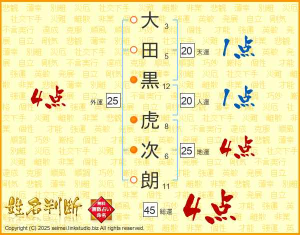 大(3画)田(5画)黒(12画) 虎(8画)次(6画)朗(11画)
