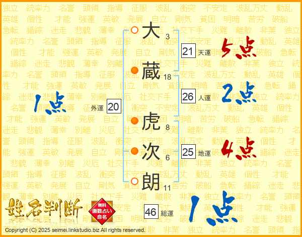 大(3画)蔵(18画) 虎(8画)次(6画)朗(11画)