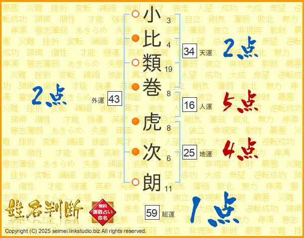 小(3画)比(4画)類(19画)巻(8画) 虎(8画)次(6画)朗(11画)