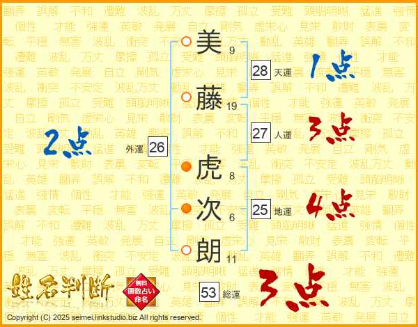 美(9画)藤(19画) 虎(8画)次(6画)朗(11画)