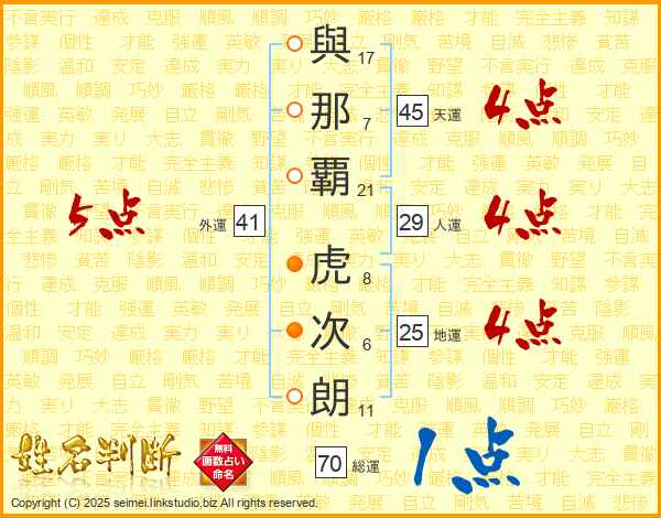 與(17画)那(7画)覇(21画) 虎(8画)次(6画)朗(11画)