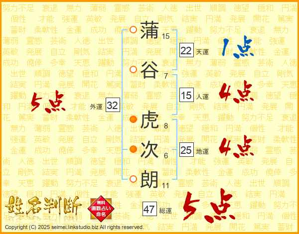 蒲(15画)谷(7画) 虎(8画)次(6画)朗(11画)