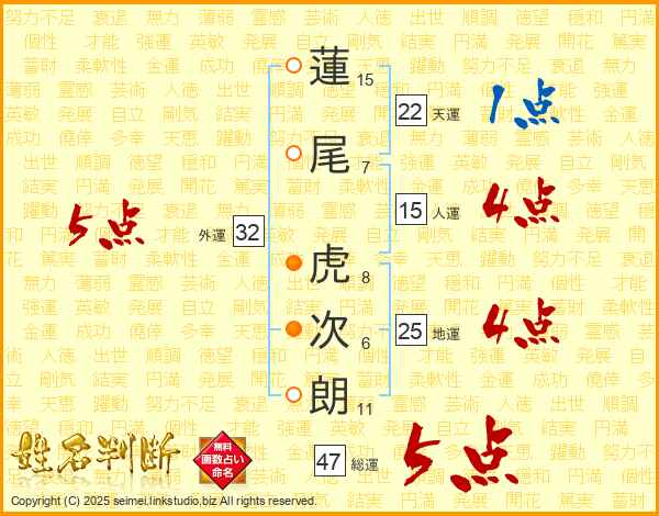 蓮(15画)尾(7画) 虎(8画)次(6画)朗(11画)