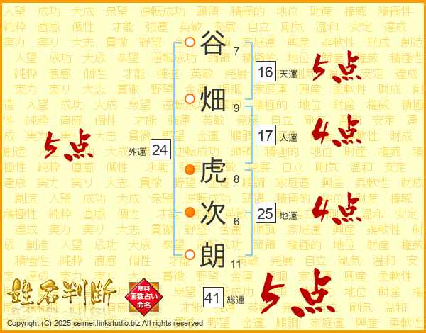 谷(7画)畑(9画) 虎(8画)次(6画)朗(11画)