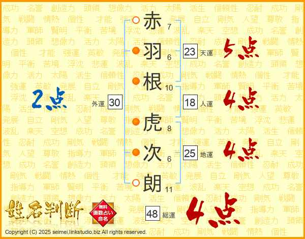 赤(7画)羽(6画)根(10画) 虎(8画)次(6画)朗(11画)