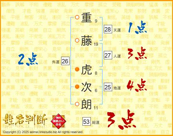 重(9画)藤(19画) 虎(8画)次(6画)朗(11画)