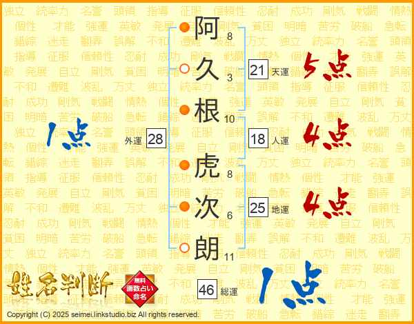 阿久根虎次朗さんの天運は21画の5点!