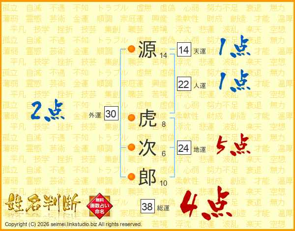 生活面を象徴する運勢です。外部から受ける影響力を表し、結婚運、家庭運や職場、環境への順応性を表します。総運から人運を引いた画数。姓や名が1文字の場合を除く。