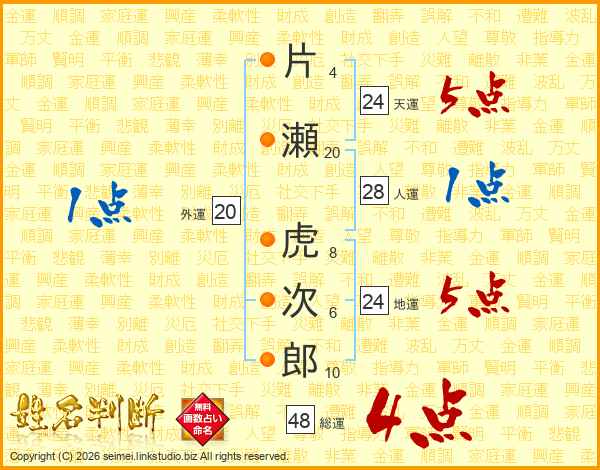 片(4画)瀬(20画) 虎(8画)次(6画)郎(10画)