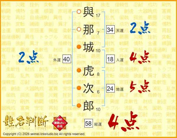 與(17画)那(7画)城(10画) 虎(8画)次(6画)郎(10画)