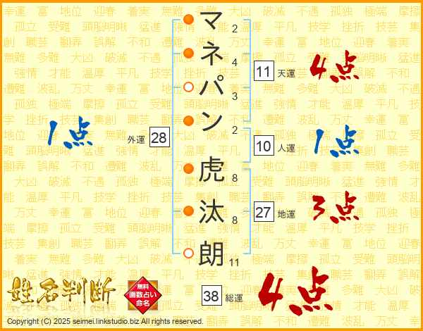 マ(2画)ネ(4画)パ(3画)ン(2画) 虎(8画)汰(8画)朗(11画)