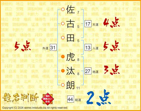 佐(7画)古(5画)田(5画) 虎(8画)汰(8画)朗(11画)