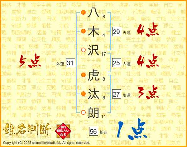八(8画)木(4画)沢(17画) 虎(8画)汰(8画)朗(11画)