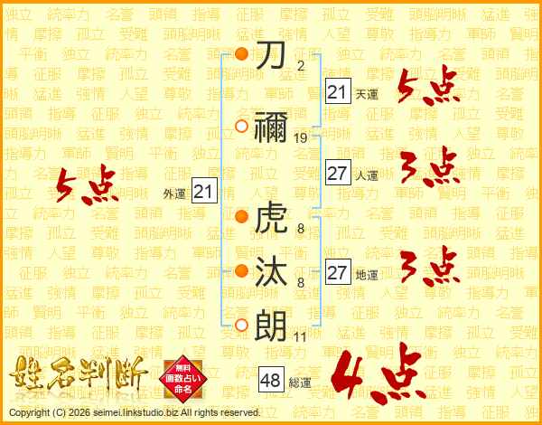 刀(2画)禰(19画) 虎(8画)汰(8画)朗(11画)