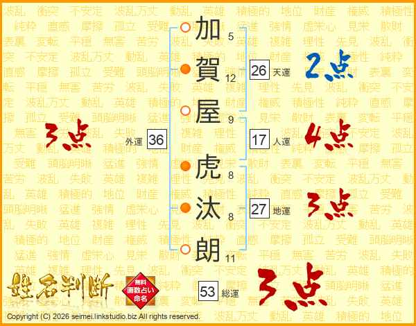 加賀屋虎汰朗さんの天運は26画の2点!