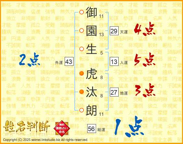御(11画)園(13画)生(5画) 虎(8画)汰(8画)朗(11画)