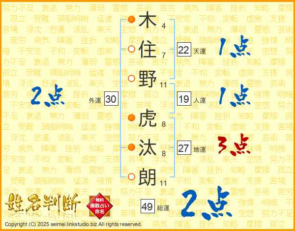 木(4画)住(7画)野(11画) 虎(8画)汰(8画)朗(11画)