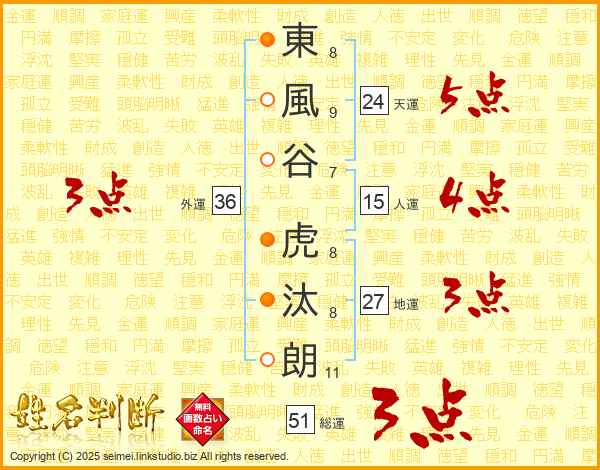 東(8画)風(9画)谷(7画) 虎(8画)汰(8画)朗(11画)