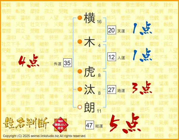 横(16画)木(4画) 虎(8画)汰(8画)朗(11画)