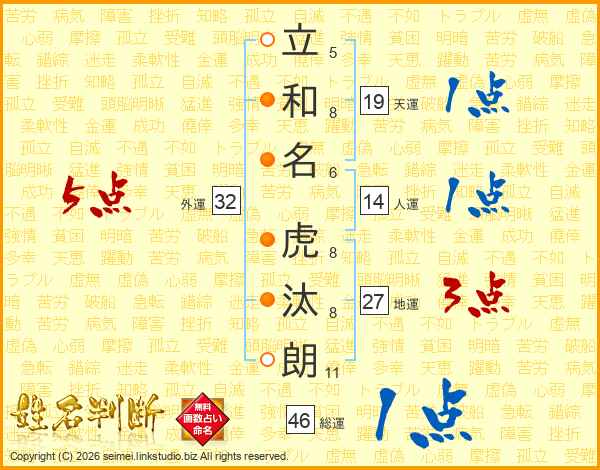 生活面を象徴する運勢です。外部から受ける影響力を表し、結婚運、家庭運や職場、環境への順応性を表します。総運から人運を引いた画数。姓や名が1文字の場合を除く。
