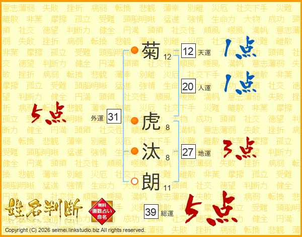 菊虎汰朗さんの総運は39画の5点!