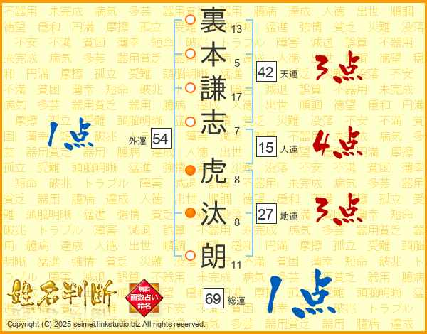 裏本謙志虎汰朗さんの人運は15画の4点!