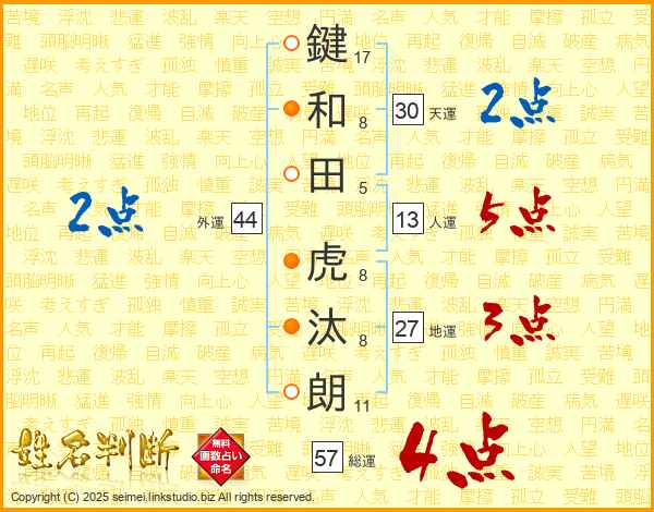 鍵(17画)和(8画)田(5画) 虎(8画)汰(8画)朗(11画)