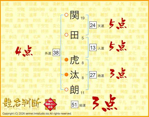関(19画)田(5画) 虎(8画)汰(8画)朗(11画)