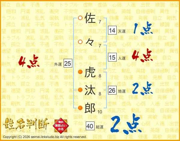 佐(7画)々(7画) 虎(8画)汰(8画)郎(10画)