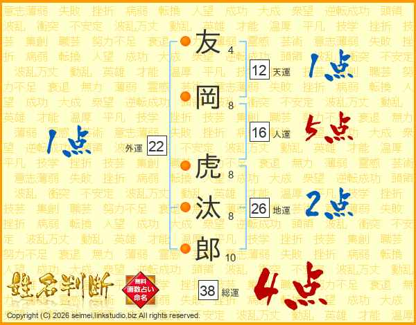友(4画)岡(8画) 虎(8画)汰(8画)郎(10画)