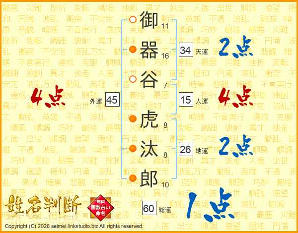 御(11画)器(16画)谷(7画) 虎(8画)汰(8画)郎(10画)