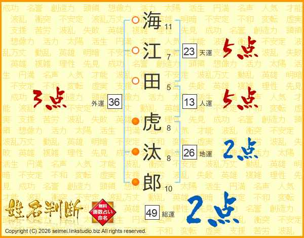 海(11画)江(7画)田(5画) 虎(8画)汰(8画)郎(10画)