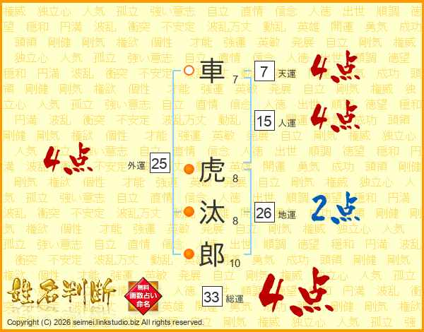 車(7画) 虎(8画)汰(8画)郎(10画)