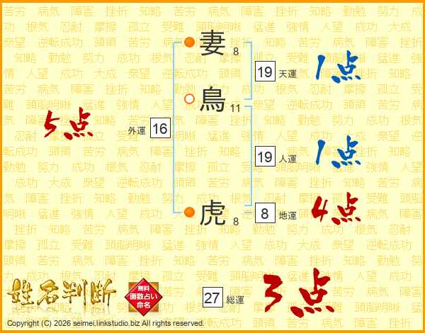 妻鳥虎さんの総運は27画の3点!