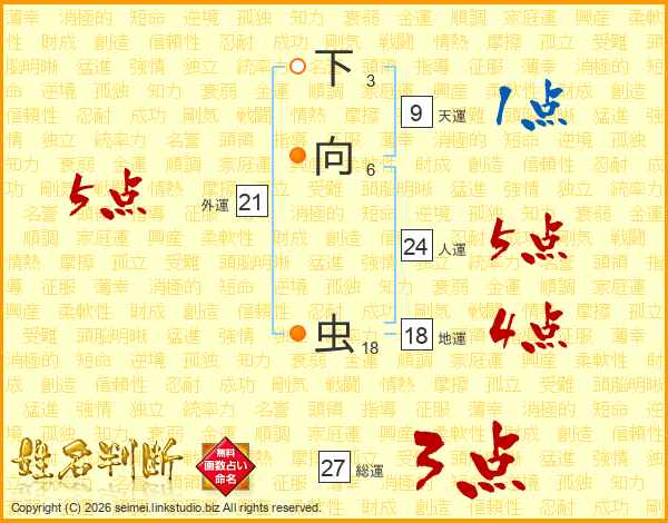 生活面を象徴する運勢です。外部から受ける影響力を表し、結婚運、家庭運や職場、環境への順応性を表します。総運から人運を引いた画数。姓や名が1文字の場合を除く。