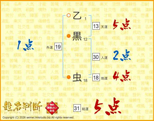 乙黒虫さんの総運は31画の5点!