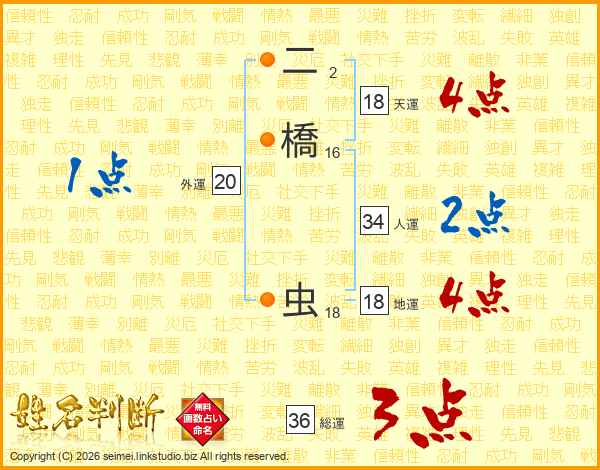 生活面を象徴する運勢です。外部から受ける影響力を表し、結婚運、家庭運や職場、環境への順応性を表します。総運から人運を引いた画数。姓や名が1文字の場合を除く。