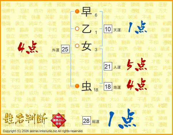 早乙女虫さんの総運は28画の1点!