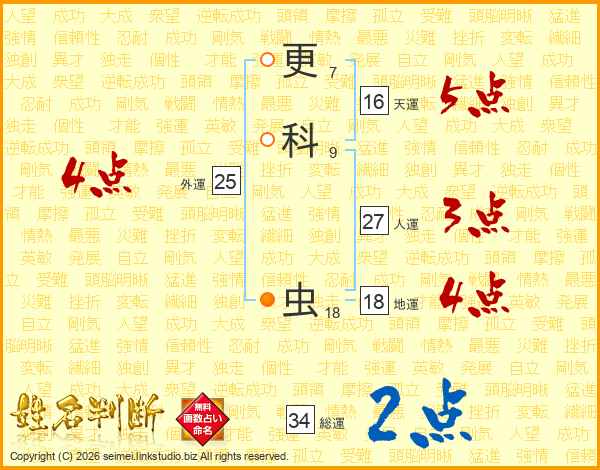 生活面を象徴する運勢です。外部から受ける影響力を表し、結婚運、家庭運や職場、環境への順応性を表します。総運から人運を引いた画数。姓や名が1文字の場合を除く。