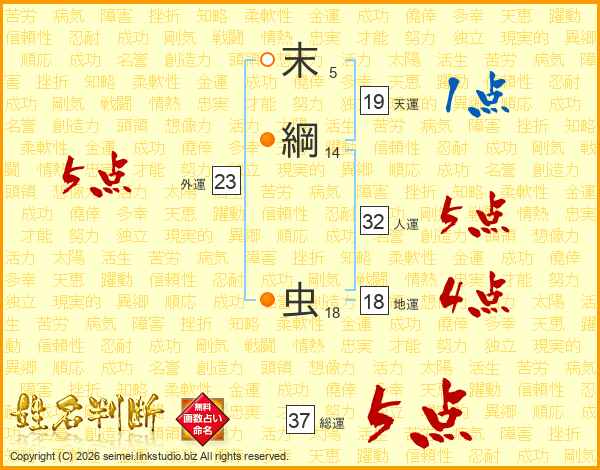 生活面を象徴する運勢です。外部から受ける影響力を表し、結婚運、家庭運や職場、環境への順応性を表します。総運から人運を引いた画数。姓や名が1文字の場合を除く。