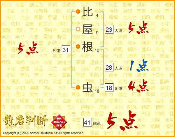 生活面を象徴する運勢です。外部から受ける影響力を表し、結婚運、家庭運や職場、環境への順応性を表します。総運から人運を引いた画数。姓や名が1文字の場合を除く。