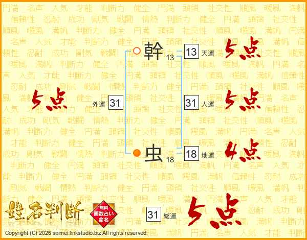 生活面を象徴する運勢です。外部から受ける影響力を表し、結婚運、家庭運や職場、環境への順応性を表します。総運から人運を引いた画数。姓や名が1文字の場合を除く。